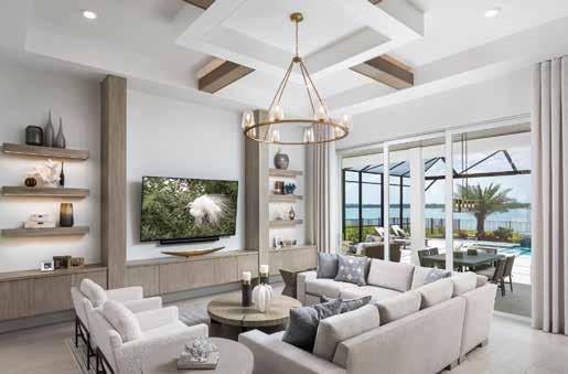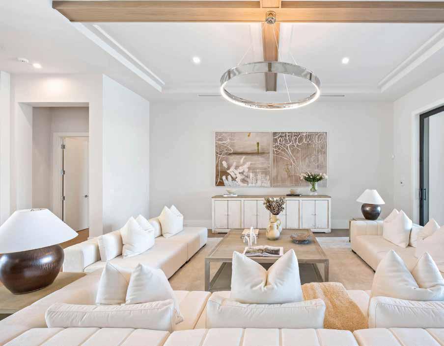 Soft neutrals, sculptural furniture, and natural light define the great room — a serene centerpiece where coastal elegance meets comfort. The vaulted ceiling and streamlined fireplace create height and balance, while curved seating invites conversation around the modern hearth. Thoughtfully layered textures and oceanic hues echo the home’s beachside inspiration, making this living space both refined and relaxed, a perfect reflection of the homeowners’ signature approach to livable luxury.