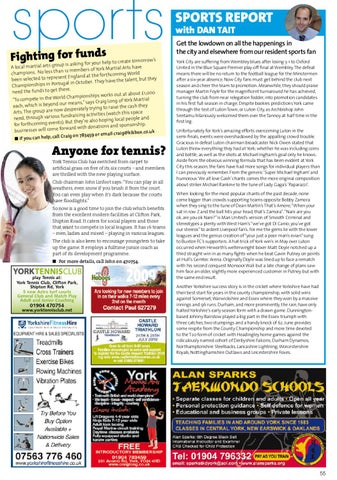 A local martial art rtial Arts have n 12 members of York Ma champions. No less tha oming World thc for ent England at the been selected to repres e the talent, but they hav y The tugal in October. Championships in Por there. need the funds to get rks out at about £1,000 rld Championships wo “To compete in the Wo Long of York Martial our means,” says Craig each, which is beyond raise the cash they w desperately trying to Arts. The group are no tch this space fundraising activities (wa need, through various local people and g pin ). But they’re also ho for forthcoming events d sponsorship. ward with donations an businesses will come for ail craig@kikbox.co.uk Craig on 783459 or em Q If you can help, call