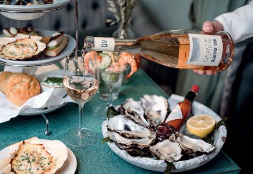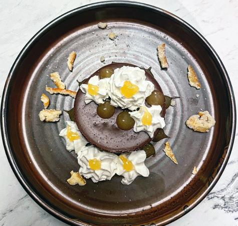 As you approach Ate O’Clock and its iconic arched alley lit with fairy lights, you know you’re in for something pretty magical. After hearing rave reviews following its recent refurbishment, we couldn’t wait to finally go and try this plush restaurant out for ourselves. Our welcome was warm, and whilst we were early, we were asked if we wanted to sit in the adjoining venue, Social 8, for a pre-dinner drink. Sitting down on a blue leather seat, I admire the chilled bar area, which features pretty, floral decor, with hints of gold and vibrant neon lights. The drinks menu is extensive, and after some tricky decision-making, I opt for the Inside Scoop cocktail. Presented in a glass ice cream cone with a dry ice ‘scoop’, the Inside Scoop is a delicious Baileys and raspberry purée -based drink that tastes like something straight out of a Häagen-Dazs tub. Heading into the heated and roofed terrace, a friendly frontof-house member takes us to
