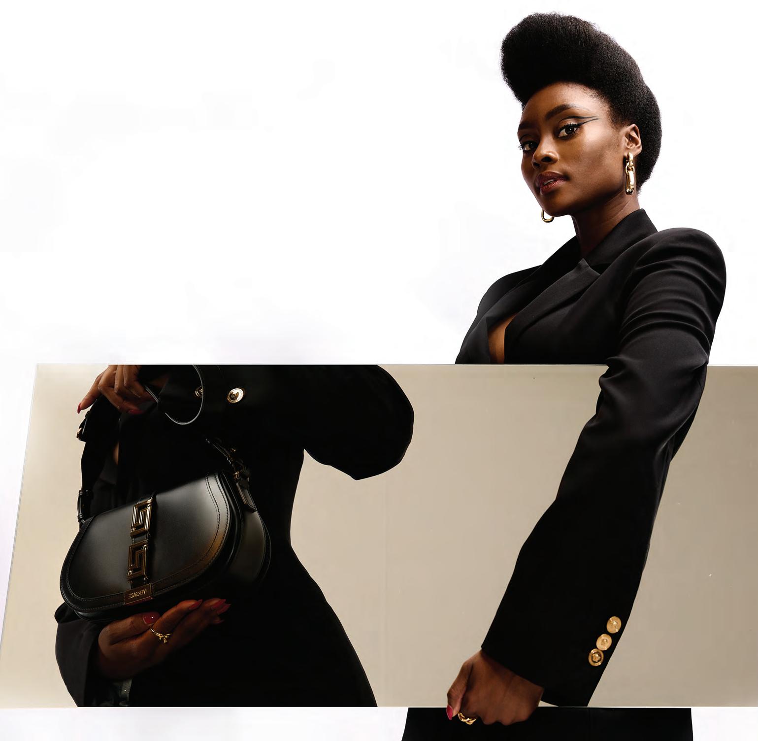 OPPOSITE Corset mini dress, R69 700, Greca Goddess bag, R56 000 mini Greca Goddess bag, R16 995, all VERSACE