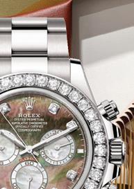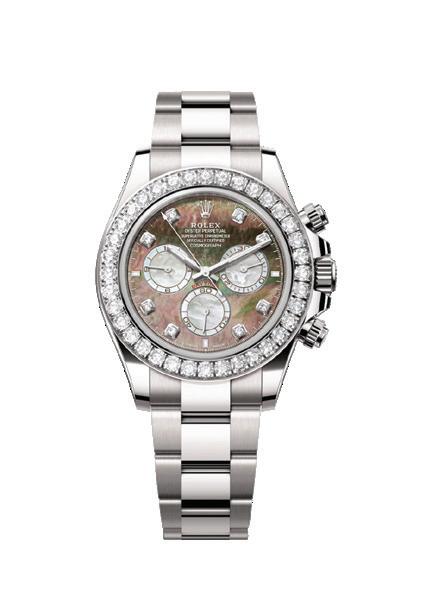 Rolex revealed two exclusive Oyster Perpetual Cosmograph Daytona versions this year, distinguished by their contrasting dials crafted from natural mother-of-pearl, accented with diamonds and Chromalight hour markers. Each timepiece, made from 18kt white gold with diamond-set bezels, features a unique colour combination of white and black mother-of-pearl dials, highlighting a technically demanding manufacturing process to enhance the vibrancy and contrast of the materials. POA, rolex.com
