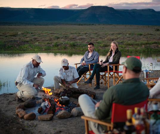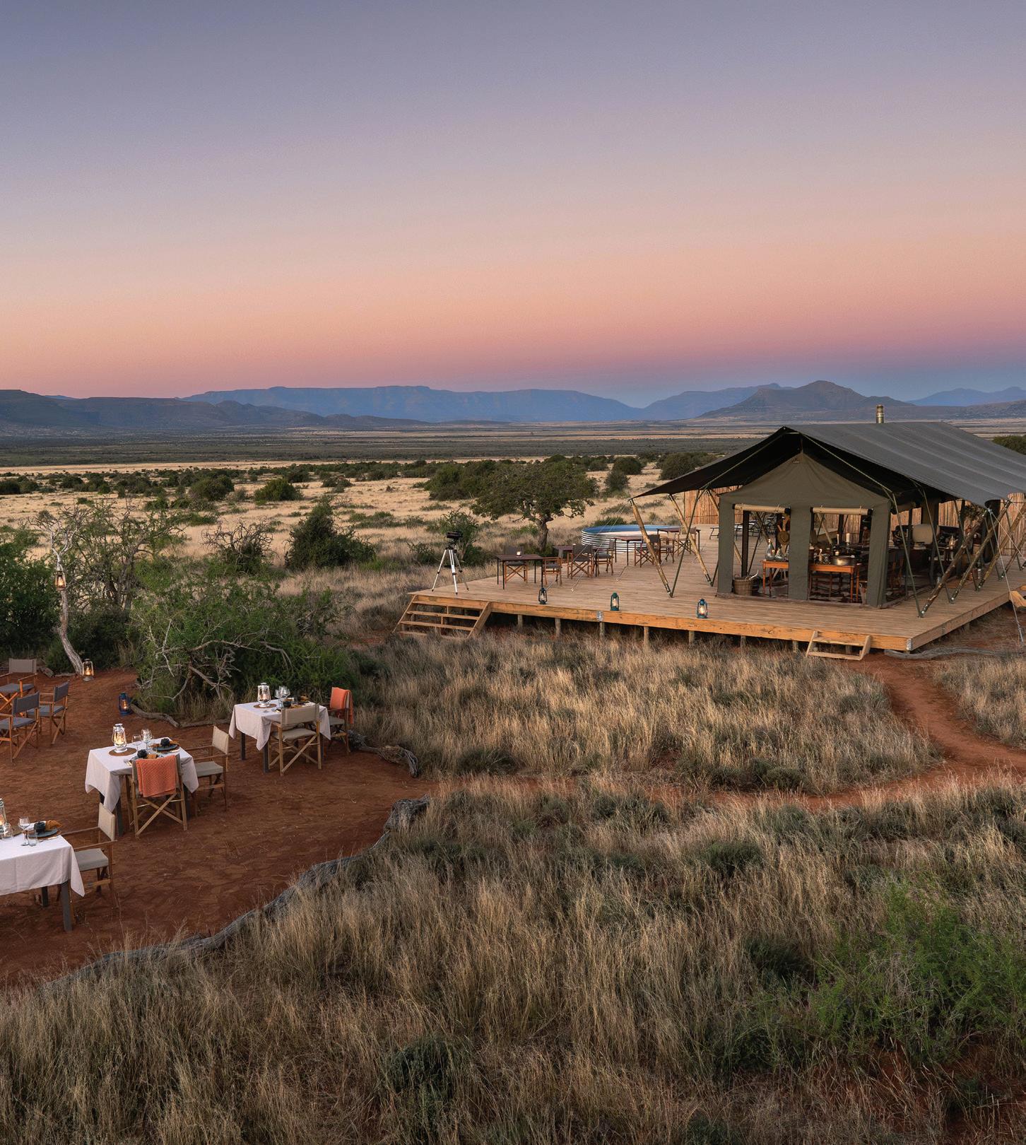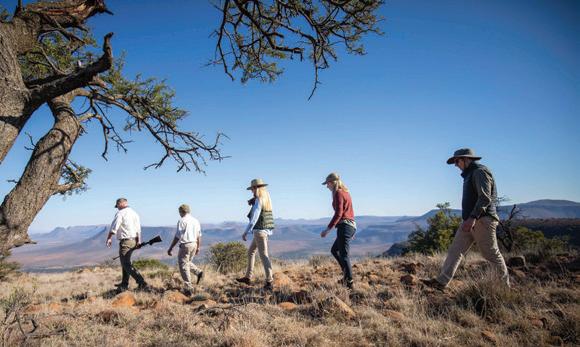 heated bucket showers. There’s a deck with a lounger if you want to enjoy the solitude, while the main tent where meals are served has a pool, expansive deck, and a bar and lounge area. You travel light (water and snacks are provided), and your overnight bag is transported to the mobile fly camp ahead of you. Each day covers around 10 to 15 kilometres, so the trail is accessible for moderately fit guests, while still being physically rewarding. Walkers are led by seasoned guides and trackers who bring the landscape to life with their fascinating stories of wildlife encounters, educational sessions on the local fauna, flora, rock formations and conservation efforts, as well as entertaining anecdotes about Karoo life.