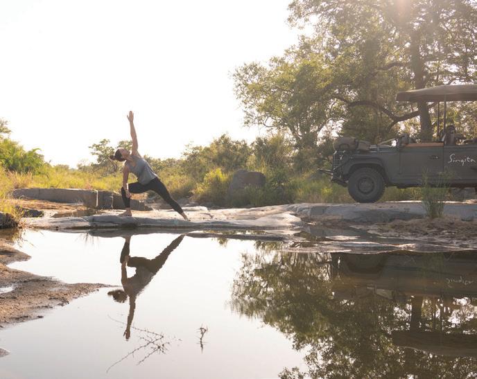 Indoor heated pool at Santé Wellness; the foot scrub ritual at Singita uses sand from the river banks; outdoor yoga at Singita; patients at Vivari Aesthetics are discharged into aftercare at the five-star Vivari Hotel