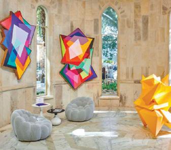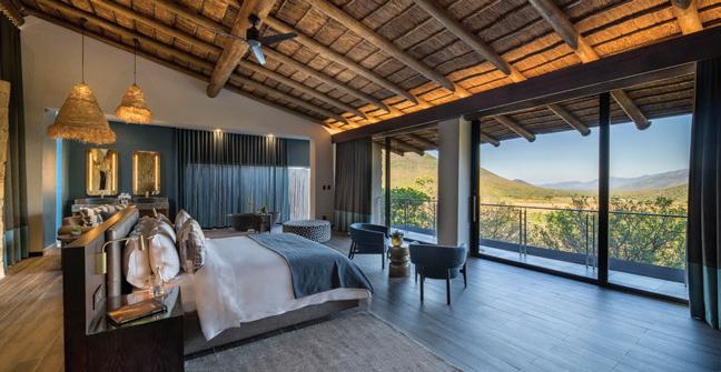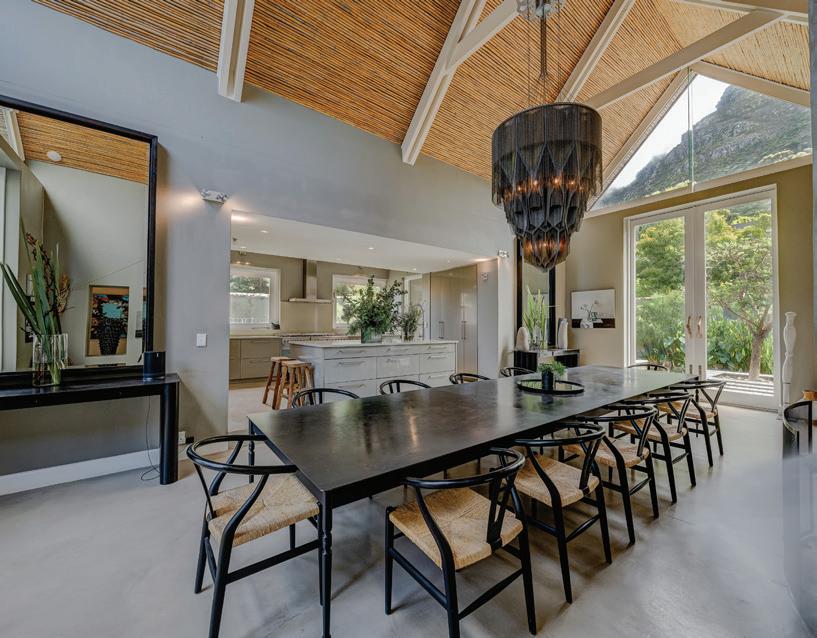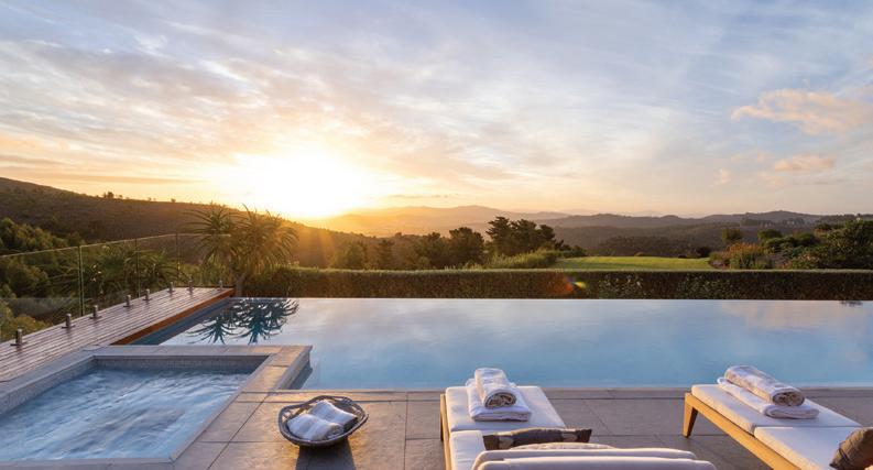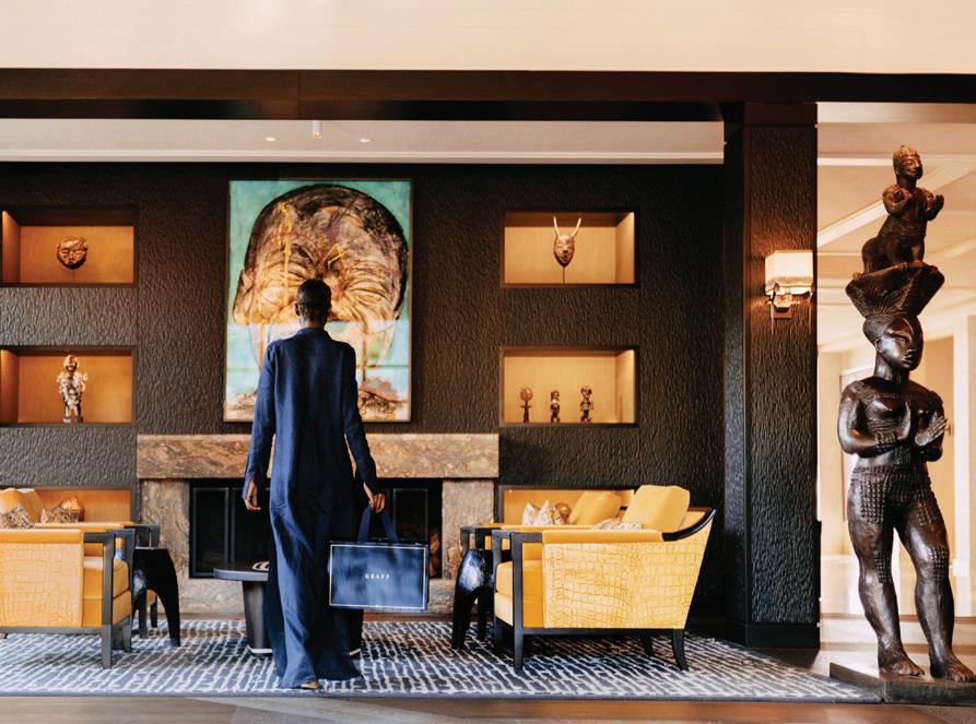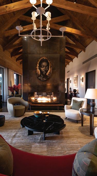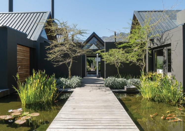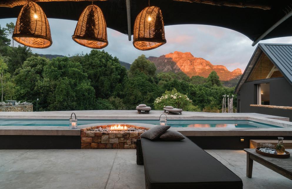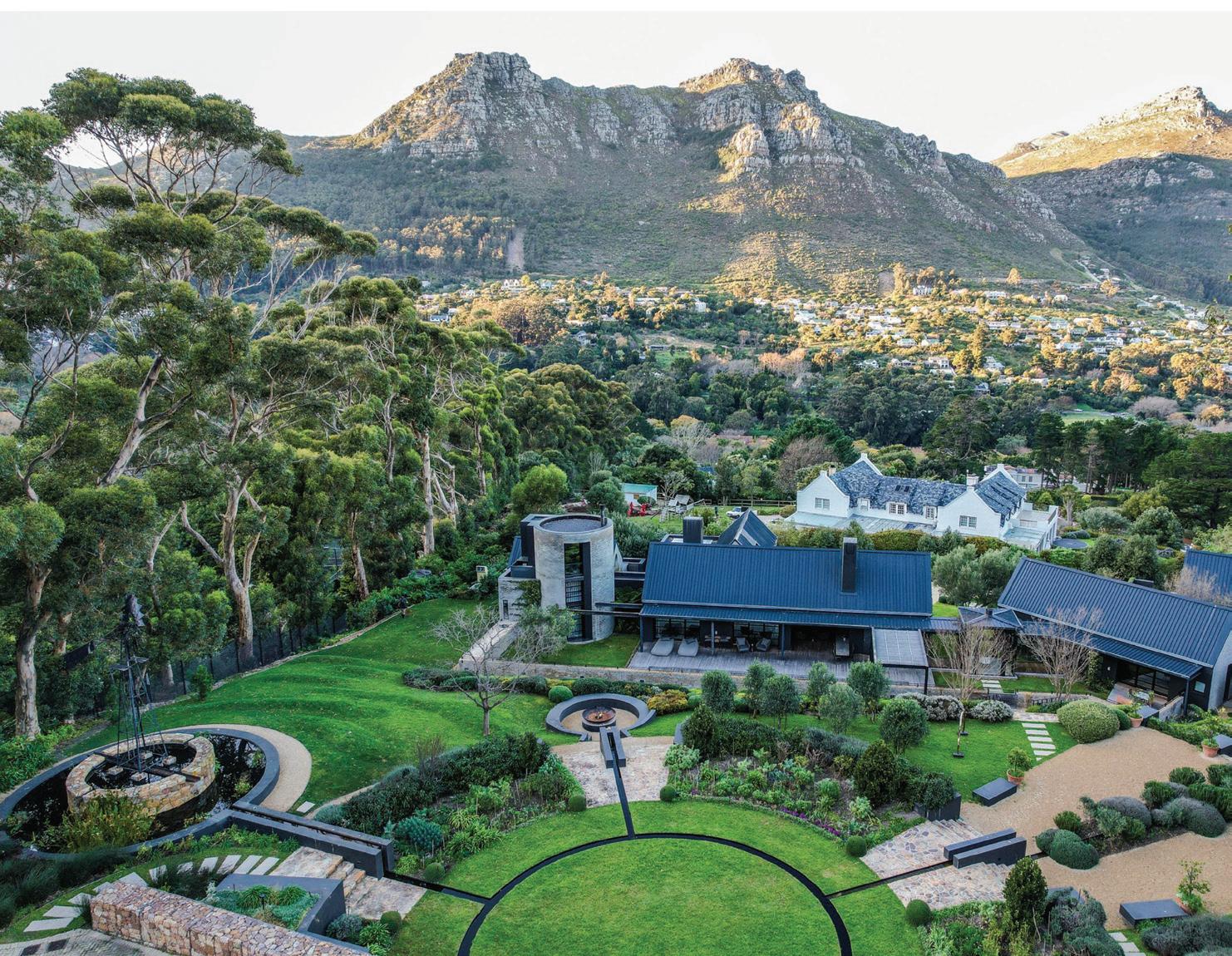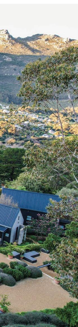 o get to the front door of Maison Noir, one of the exclusive-use villas in Cape Town’s Future Found Sanctuary, you drive through a grand black gate on a bend in one of the slopey streets of Hout Bay. Once opened, it reveals a secluded seven-acre getaway against a setting that never gets old: Table Mountain serving as a wellsuited backdrop to the estate’s sustainably landscaped garden. The private mountain retreat houses three villas that operate as 11 individual rooms, each with a unique personality and a well-curated collection of local art.