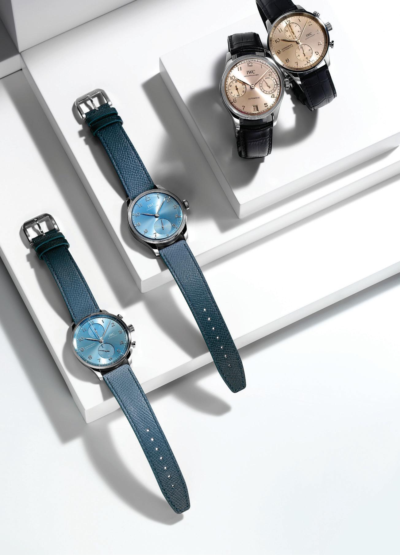 OPPOSITE, FROM LEFT: Portugieser Chronograph (IW371626), Automatic 40 (IW358402), Automatic (IW501705), and Chronograph (IW371624)