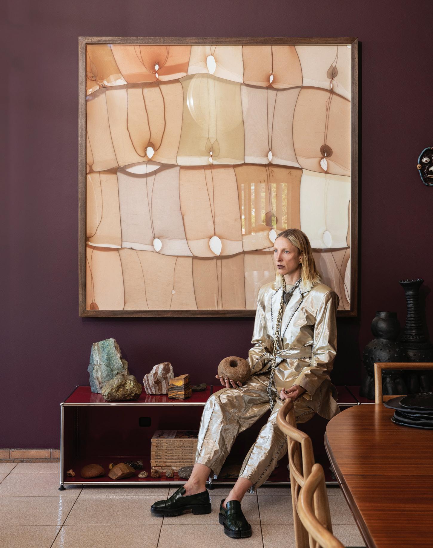 OPPOSITE: Lezanne in the dining room that opens on to the balcony. She wears a silk lamé jacket and pants from Viviers Artwork: Untitled V, 2023. Nylon pantyhose and acrylic on canvas by Turiya Magadlela