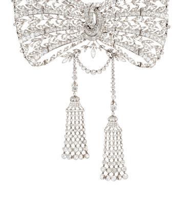 6. This Cartier Devant-de-corsage brooch (circa 1910) will be among 250 pieces auctioned by Sotheby’s in Geneva this month as part of Iconic Jewels: Her Sense Of Style, one of the most important private collections of signed jewellery to come to auction. According to Sotheby’s, the partially articulated openwork bow is composed of laurel leaves and supporting flexible tassels. It is millegrain-set throughout with circularcut diamonds, enhanced with rose diamonds and accented by marquise- and pear-shaped diamonds. Online bidding takes place from 2 – 16 May. Estimate CHF200 000 –CHF400 000, sothebys.com, cartier.com