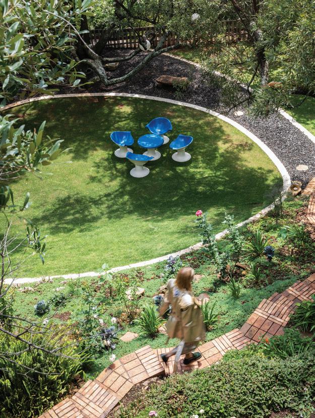 Lezanne appointed her friend and landscape artist, James Barry Slabbert, to create a sense of order and balance in the garden she had coined a “jungle space”. To do this, flower beds were given a structured circular edging surrounded by anthracite, and dahlias bloom playfully between the cacti and colourful roses. It’s another lesson in the sublime art of juxtaposition that adds to the energetic charm and soul of this extraordinary home. ■ viviersstudio.com