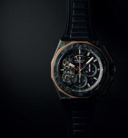 polished and matt surfaces including the bracelet, while the second is done in carbon fibre with sandblasted matt rose gold twelvesided bezel and pusher protectors on a black textured rubber strap. Its open dial, with applied chronograph counters and tinted transparent sapphire elements, allows for an unobstructed view of the groundbreaking movement and its two tourbillon mechanisms with star-shaped cages.