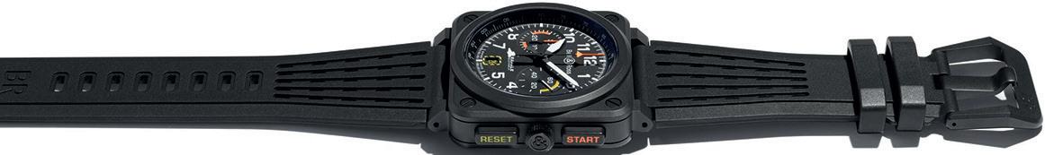 The new BR-03 Rafale Solo Display chronograph has been designed for high performance in extreme conditions. Robust, its case is made of high-tech black ceramic that is resistant to scratches. Precise, the chronograph is powered by an automatic movement, the BR-CAL.301 calibre, with a 42-hour power reserve. Readable, the dial features visual elements inspired by the world of fighter jets - such as the yellow dotted line around the date window - and highlights precision-related indicators, especially through the two orange hands for the chronograph function. The indexes and subdials are coated with photoluminescent material for optimal readability in the dark.