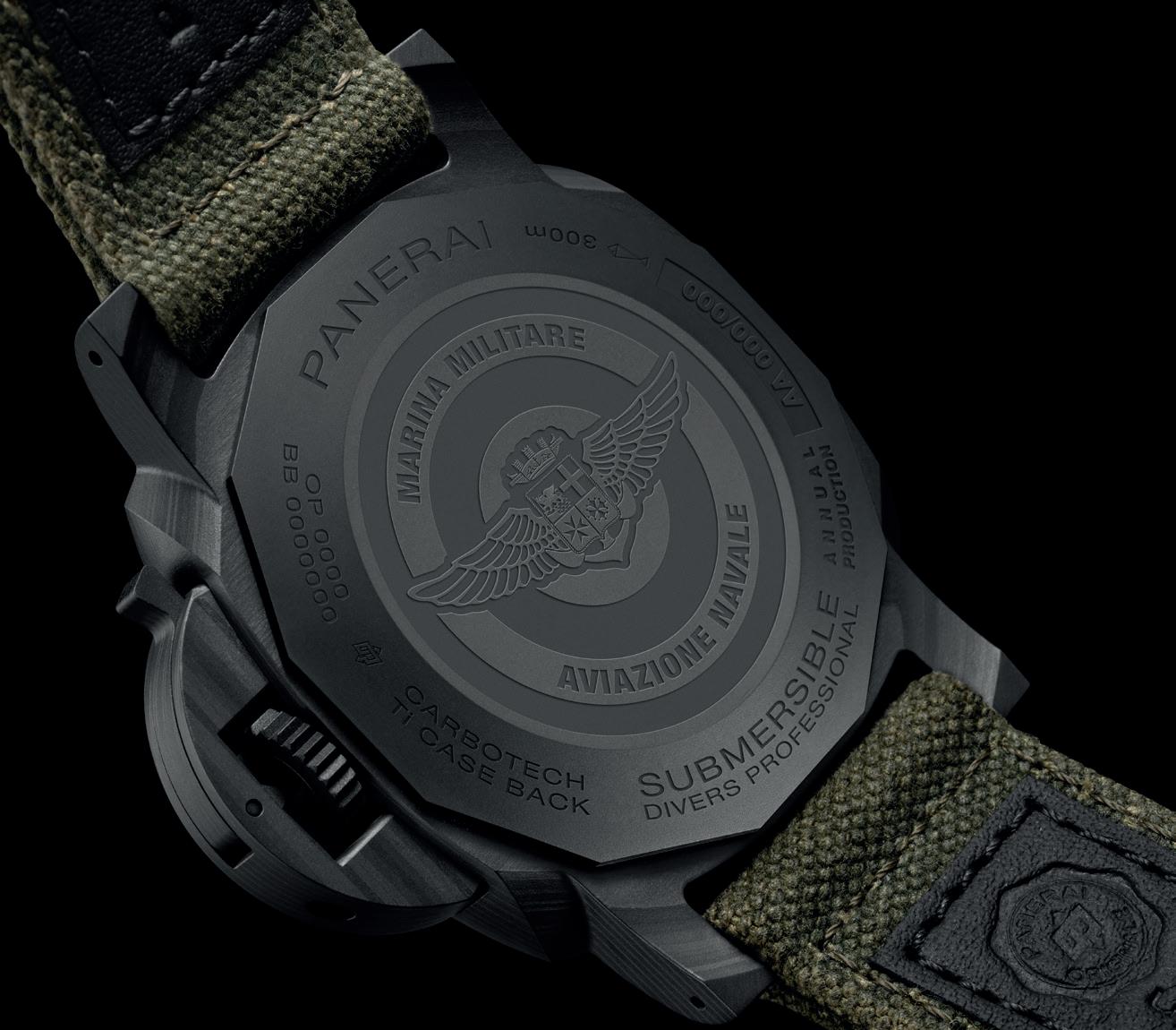 The case backs are engraved with the Aviazione Navale wings emblem, a first in Panerai’s collections, completing the watches’ refined yet robust design. Designed also for deep-sea exploration, the novelties are water resistant up to 30 bar (~300 meters), and as with all Panerai watches, these timepieces are tested to +25% of their stated water resistance. The two Submersible watches are matched with green canvas straps with distinctive T/T stitching, delivering durability and a nod to the military uniforms and they are both paired with a second black rubber strap.