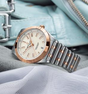 Encircling the dial of the pink gold model, a minutes track is marked in blue - a subtle punctuation in the chic tone-on-tone aesthetic of the case, bracelet, sunburst satin-finished dial and matching pink gold moon-phase display. For a more casual and sporty allure, a textured rubber strap in blue or white can be interchanged with the gold bracelet.