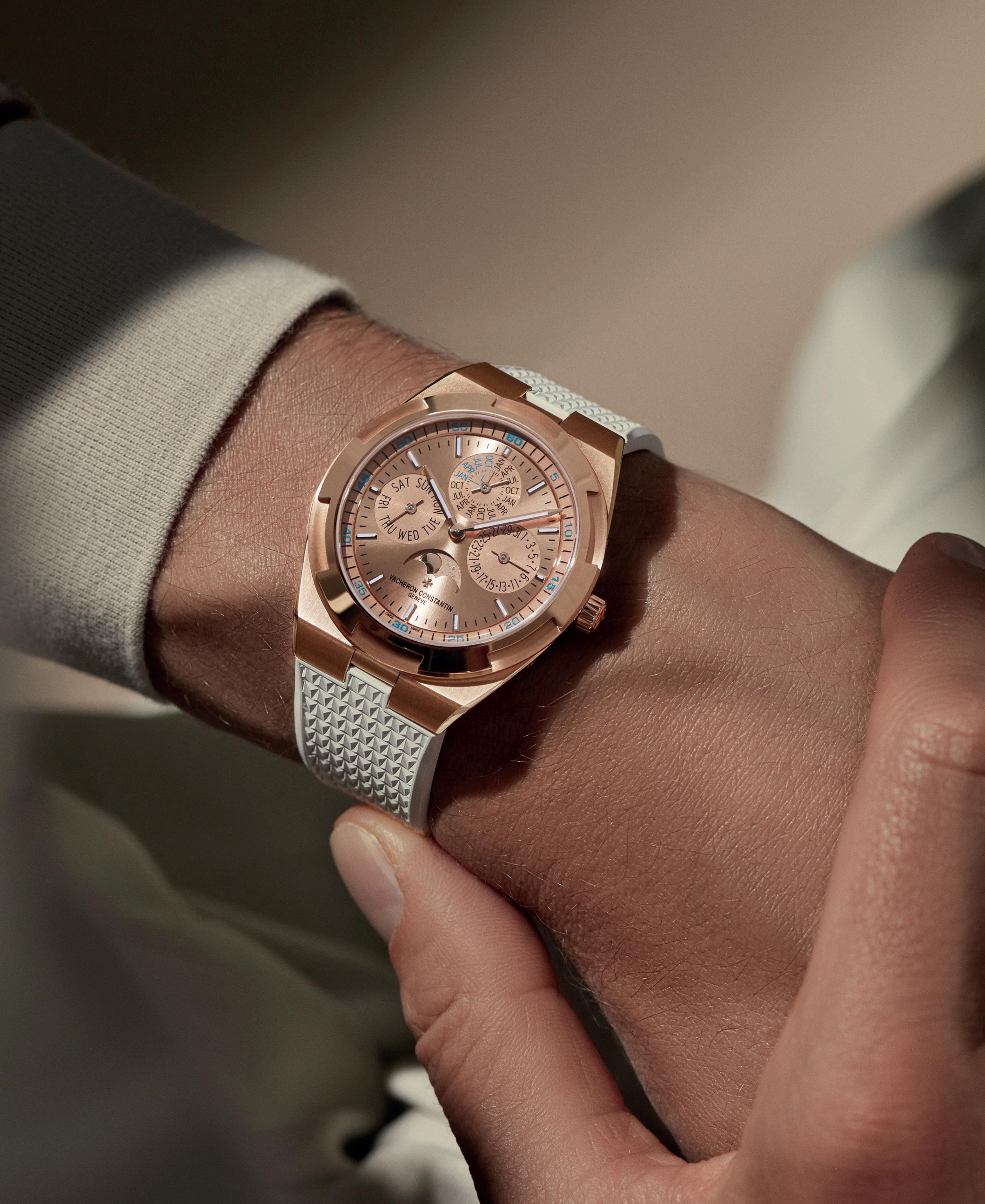 Seamlessly blending sporty elegance and versatility with an interchangeable bracelet and two additional straps, Vacheron Constantin enriches the Overseas collection with two new interpretations of the Overseas Perpetual Calendar Ultra-Thin: in pink gold with a matching pink gold dial and in white gold with a burgundy lacquer dial. Both models are presented in 41.5 mm cases with 18K gold bracelets and two additional rubber straps in different colours.