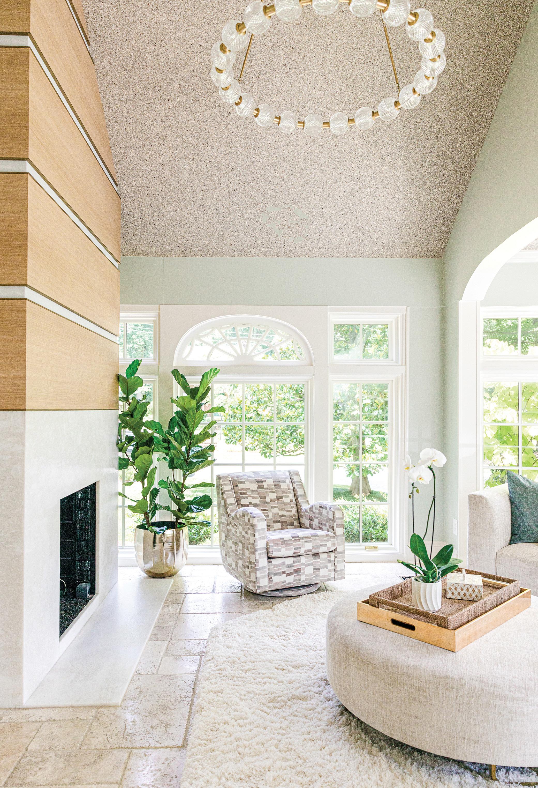 The dual-sided fireplace between the sunroom and living room became a focal point of the project. Vertical rift-sawn white oak panels rise toward a vaulted ceiling, separated by what appears to be stone but is actually expertly applied faux painting. Pat’s team first dry-installed the paneling, allowing the homeowners to see the complete look before taking the pieces back to their workshop for finishing. Above, the vaulted ceiling features distinctive wallpaper with a cork-like texture that adds warmth to the space.