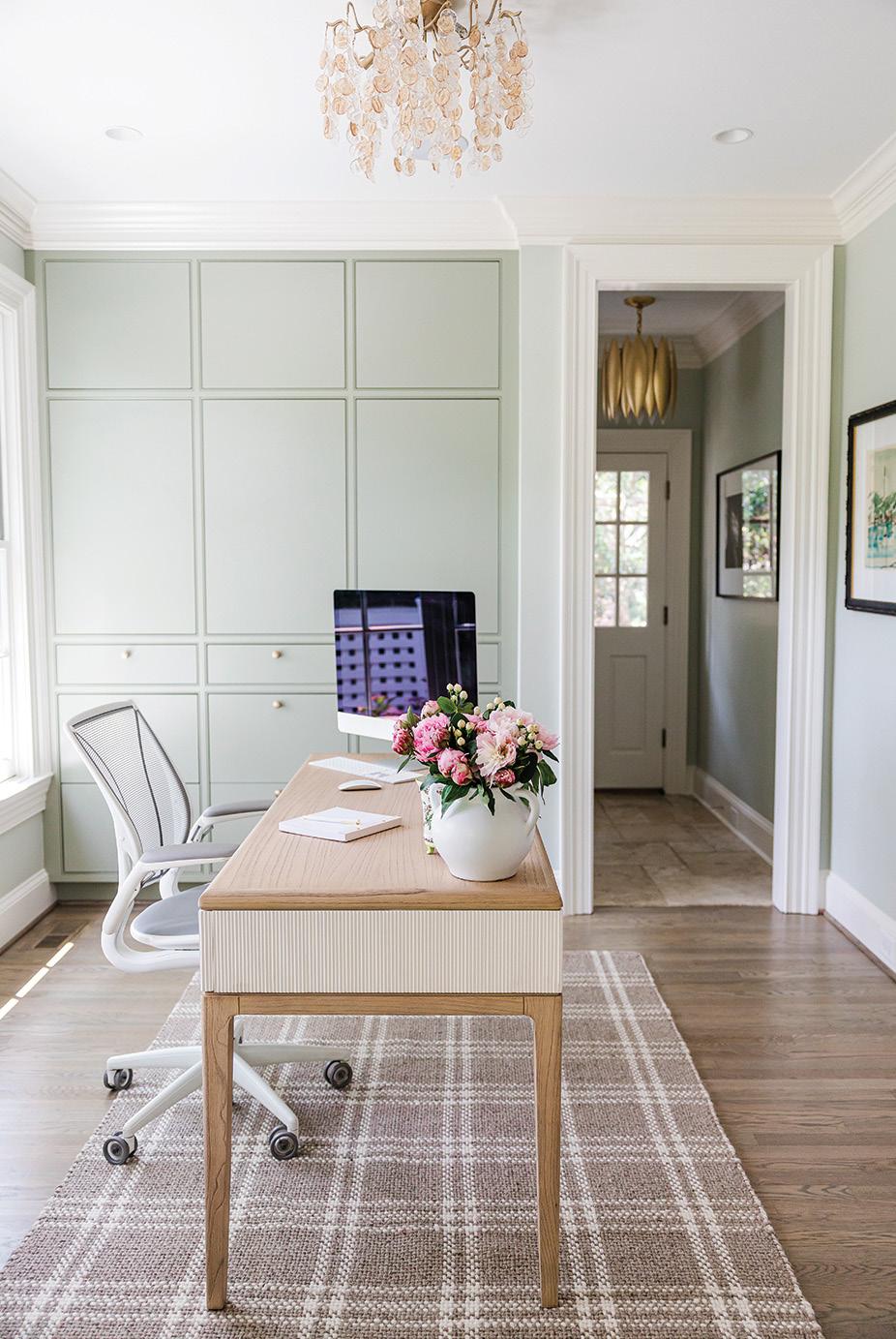 The office area showcases Classic Construction’s expertise with floor-to-ceiling built-ins featuring ingenious hidden compartments. Push-latch panels conceal printers, filing systems and household supplies.