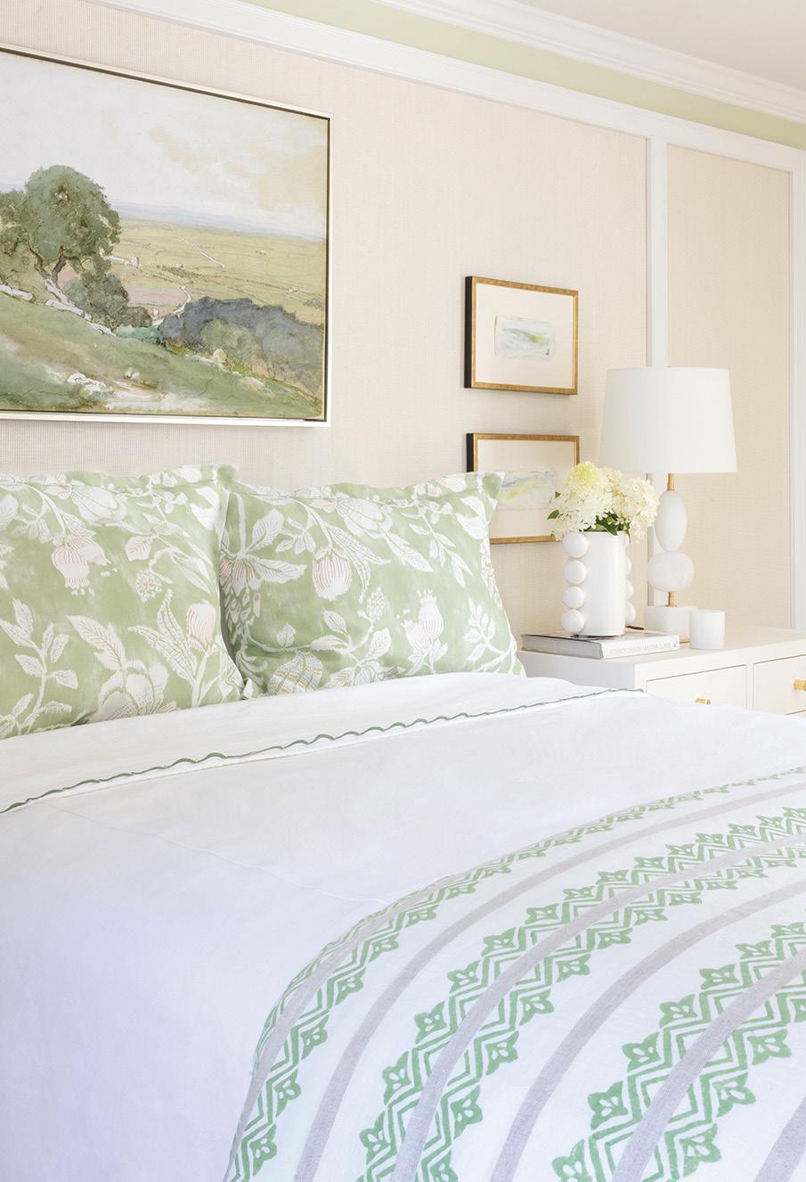 The designers also added art from Celadon to the wall to help fill the space and flanked the bed with substantial white nightstands topped with eyecatching geometric lamps from Visual Comfort.