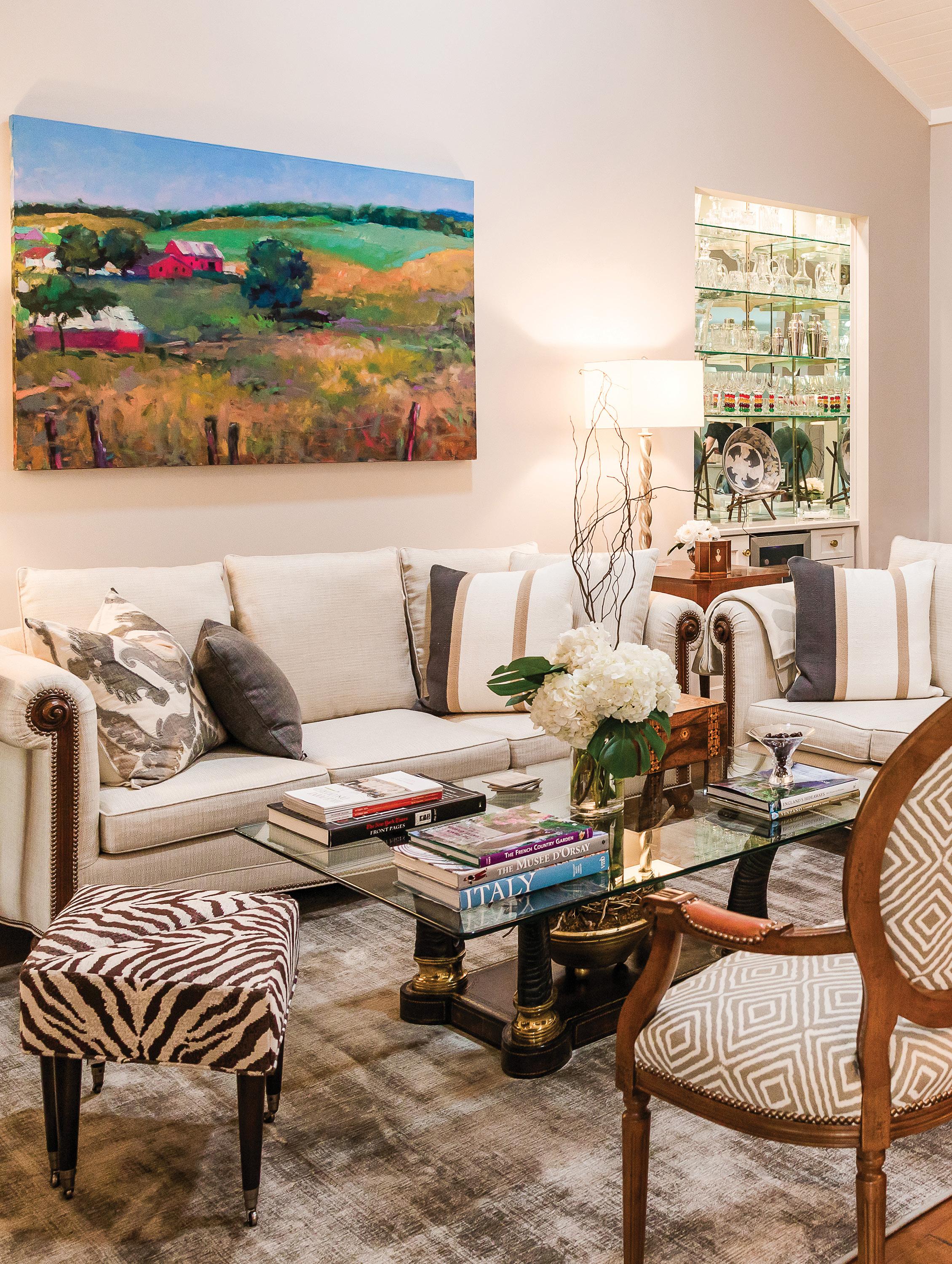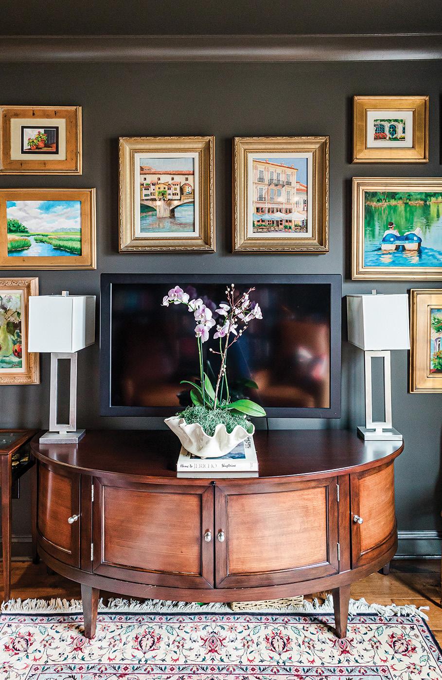Robin’s creative touch is evident throughout the home where her original paintings and personal photographs seamlessly blend art and memory. Along one wall, images captured during European river cruises, including scenes from the Louvre, Notre Dame and the streets of Rouen, offer a personal glimpse into her travels. These photographs are thoughtfully balanced by two striking paintings by Virginia artist Greg Osterhaus, creating a dynamic and cohesive display. A grand mirror, originally purchased decades ago for the hallway of their former home, now anchors the space with a sense of depth and continuity.