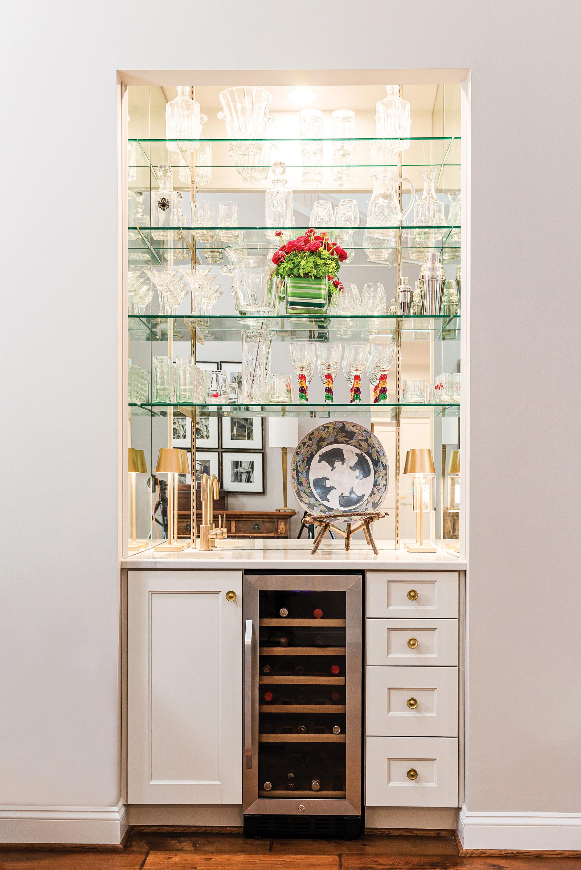 One of the most striking features of their new home is the living room ceiling—a true collaboration between Robin and their builder. Originally envisioned with simple wooden beams, the design grew organically into a vaulted ceiling adorned with slats and beams that add stunning architectural interest. The effect is both cozy and grand, drawing the eye upward while grounding the open-concept space with texture and warmth. In another creative collaboration, Robin also worked with the builder to create a small bar by pushing back the wall to form a recessed nook. This clever modification resulted in an alcove bar featuring a mirrored interior and elegant glass shelves, adding both function and a touch of glamour to the home’s design.