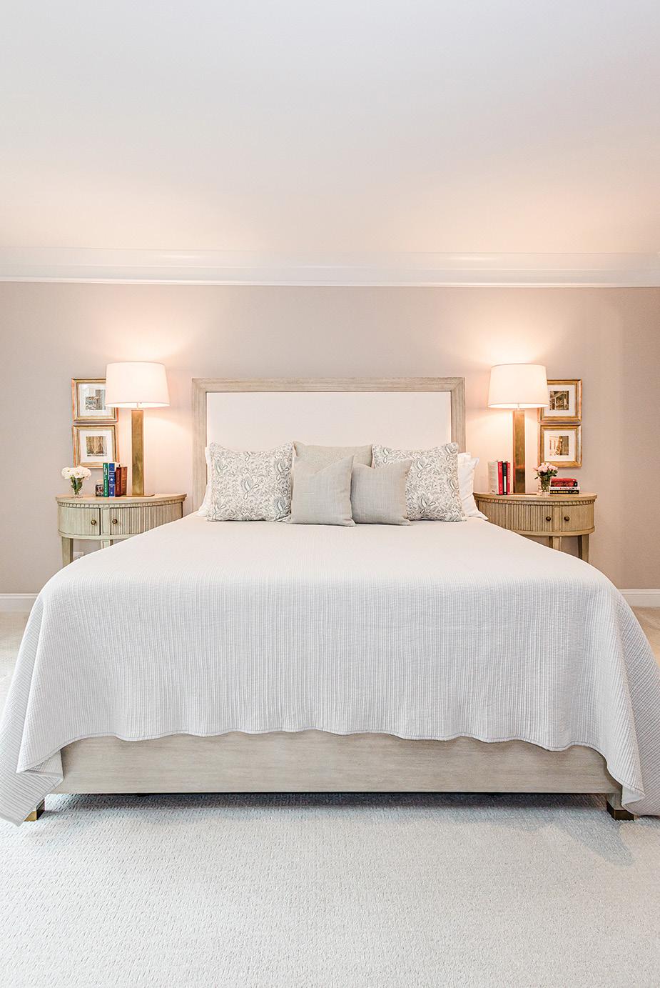 The primary bedroom continues the theme of refined comfort. Outfitted with a Henredon armoire and nightstands from Modern History, the space is elegant yet understated. An antique chair crafted by Robin’s grandfather adds a layer of family history to the serene atmosphere. More of Robin’s photographs and paintings hang on the walls, ensuring that personal expression remains a constant thread throughout the home.