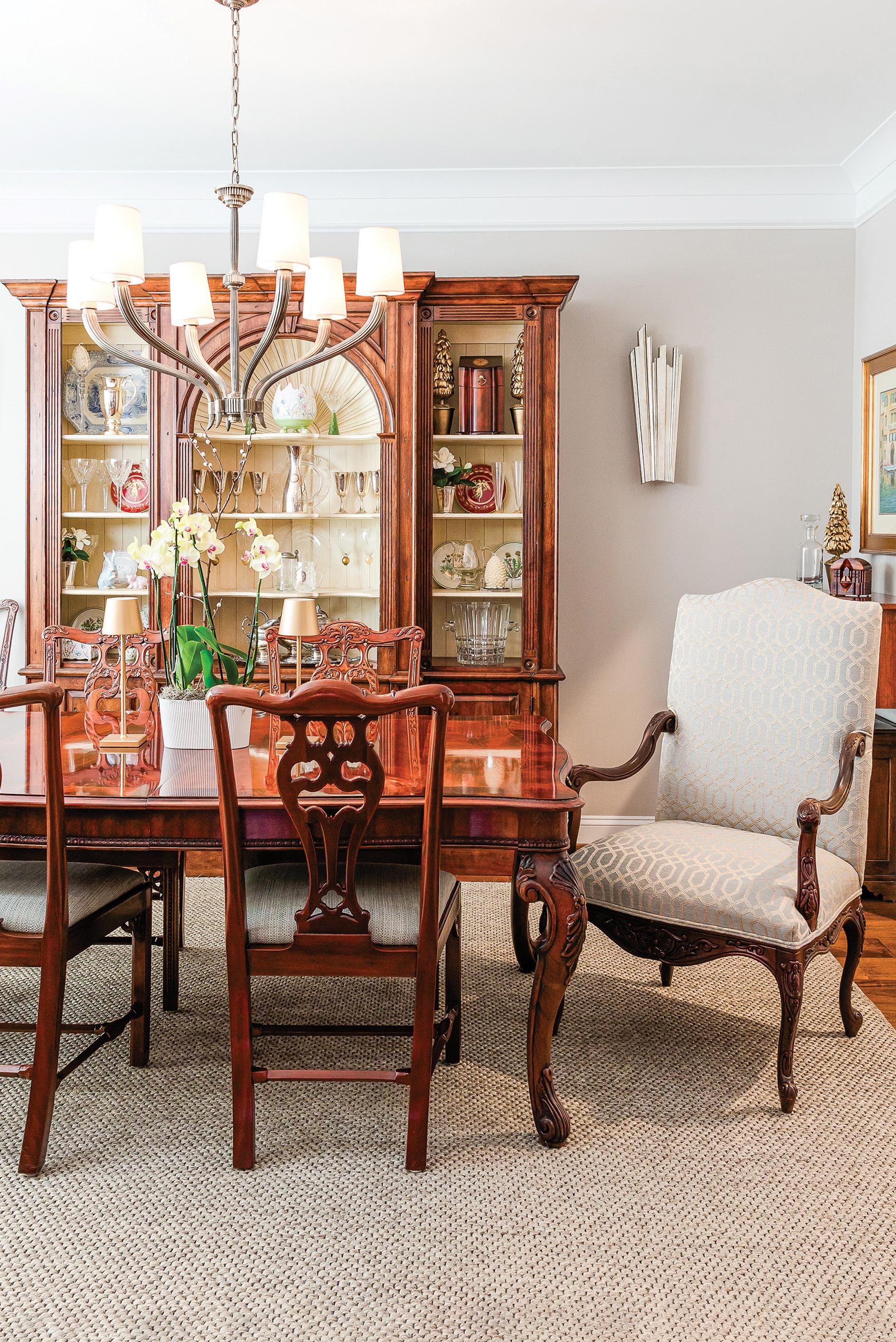 Beyond the kitchen, the dining room features a handsome breakfront housing some of the family’s most treasured keepsakes. Among them are pieces of Delft pottery collected during European travels and an extraordinary heirloom: a hand-hammered silver service dating back to the 1700s. This remarkable piece, engraved with the Blewett family name, was passed down from Charlie’s mother’s family in Plaquemines Parish, Louisiana. More than just a beautiful artifact, it serves as a tangible connection to family heritage, seamlessly integrated into the modern, stylish surroundings. These meaningful accents add a rich layer of history and character to the space, making it perfect for both everyday gatherings and special celebrations.