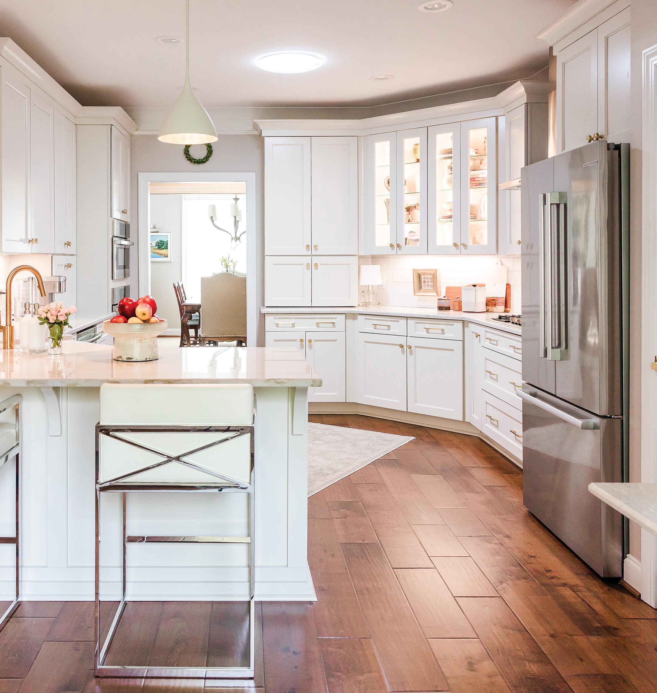 Robin’s passion for photography evolved alongside her lifelong love of painting. Over the years, she has sold both original works and giclée reproductions, with her art featured in the Modern History showroom at High Point Market—a testament to her creative journey. The kitchen captures the effortless balance of beauty and functionality that defines the entire home. Marsh cabinetry and elegant quartz countertops create a sleek foundation, while discreet pull-out shelves and hidden storage solutions keep everyday essentials within easy reach, all without disturbing the kitchen’s clean, sophisticated aesthetic. Every detail feels considered, designed to make daily living both stylish and practical.