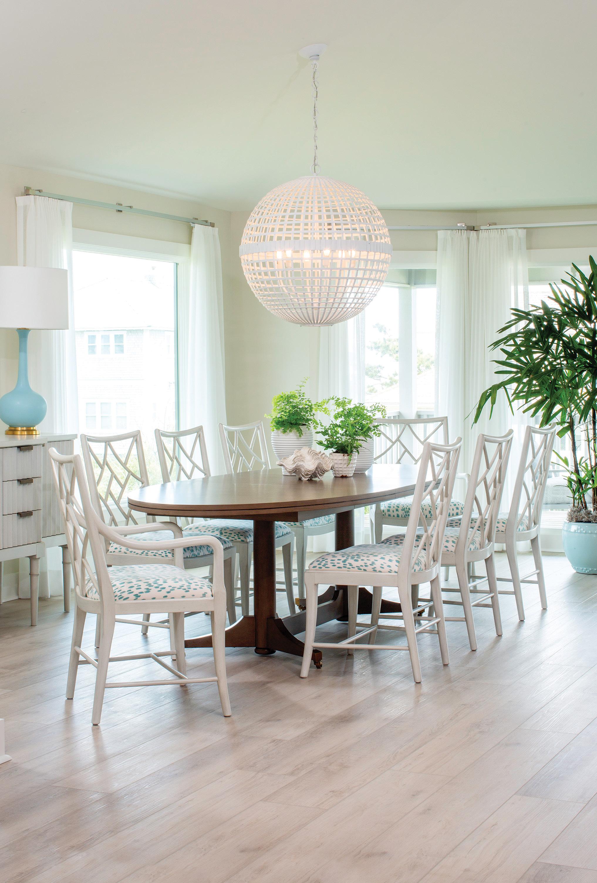 An over-scaled metal basket orb light fixture helps anchor the dining space and adds a fun, dramatic touch.