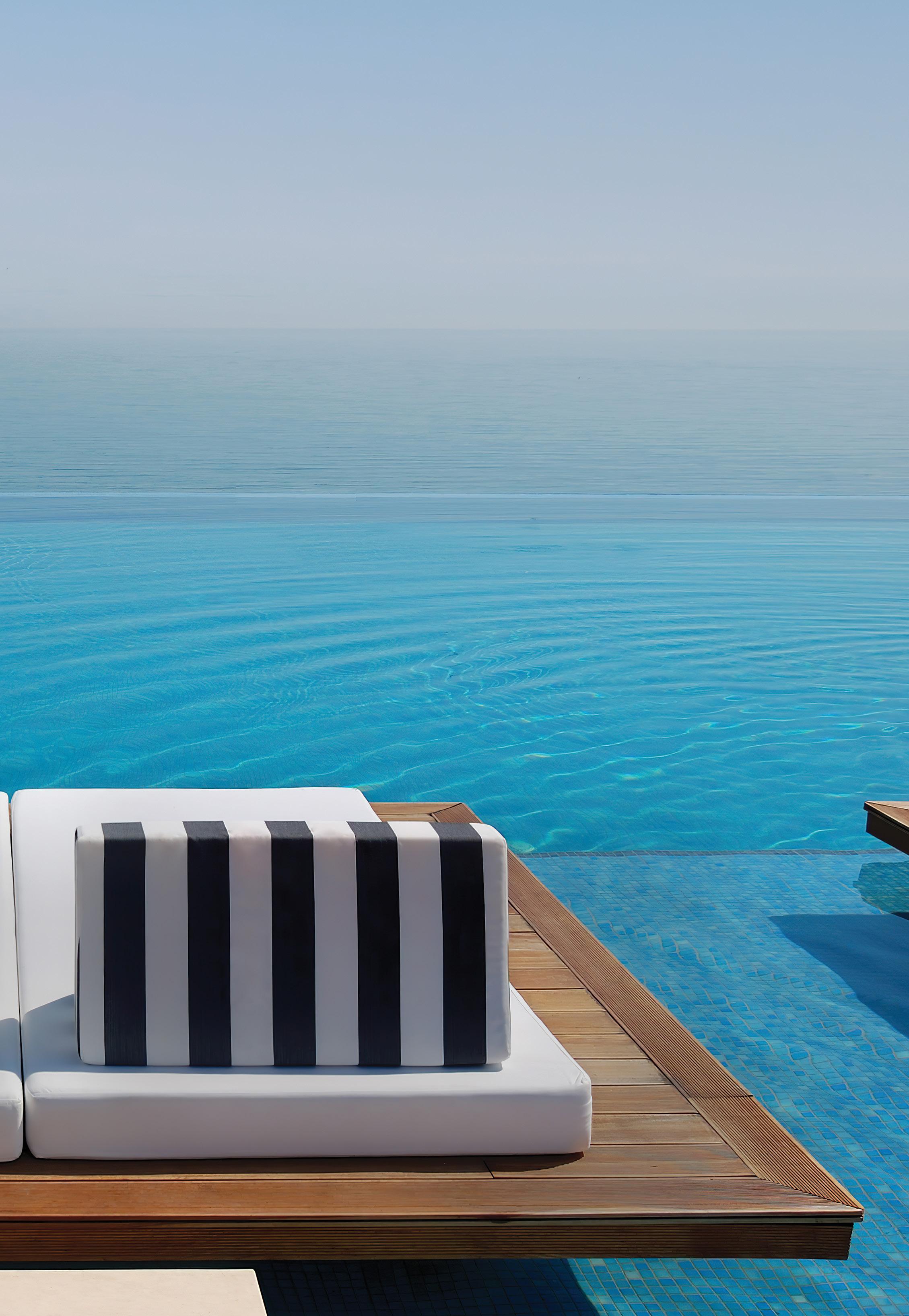 He succeeded, designing a poolscape that is chardonnay crisp and Palm Beach chic. At one end of the rectangular pool is a pristinely white pagoda. The pool has submerged steps extending the full length, providing a cool place to sit, tan and lounge. Elegant black umbrellas offer both contrast and welcome shade.