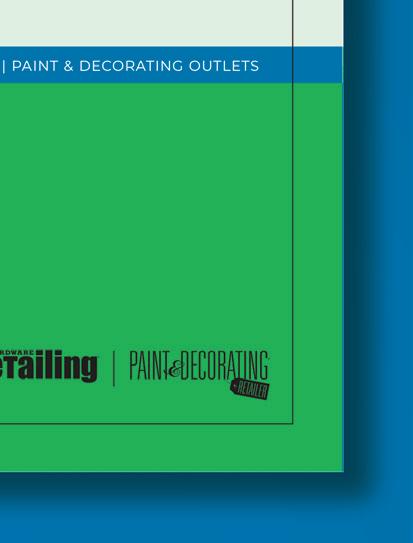 (ISSN 1096-6927): Published monthly except December by the North American Hardware and Paint Association, 1025 E. 54th St., Indianapolis, IN 46220. Phone: 800-737-0107. Subscription rates: January through November issues, $50 in U.S., payable in advance. Canada $75 per year. All other countries $100 per year. Single copy $7, except July issue, $25. Periodicals postage paid at Indianapolis, Indiana, and additional mailing offices. Postmaster: Send address changes to Paint & Decorating Retailer, P.O. Box 16709, St. Louis, MO 63105-1209. Returns (Canada): Return undeliverable magazines to P.O. Box 2600, Mississauga, Ontario L4T 0A8. PM# 41450540. Copyright © North American Hardware and Paint Association, 2023.