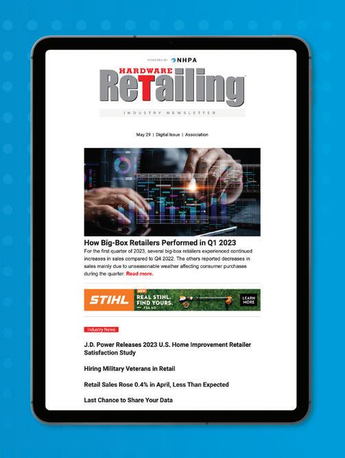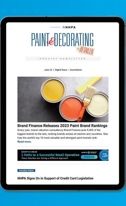 (ISSN 1096-6927): Published monthly except December by the North American Hardware and Paint Association, 1025 E. 54th St., Indianapolis, IN 46220. Phone: 800-737-0107. Subscription rates: January through November issues, $50 in U.S., payable in advance. Canada $75 per year. All other countries $100 per year. Single copy $7, except July issue, $25. Periodicals postage paid at Indianapolis, Indiana, and additional mailing offices. Postmaster: Send address changes to Paint & Decorating Retailer, P.O. Box 16709, St. Louis, MO 63105-1209. Returns (Canada): Return undeliverable magazines to P.O. Box 2600, Mississauga, Ontario L4T 0A8. PM# 41450540. Copyright © North American Hardware and Paint Association, 2024.