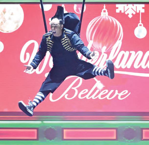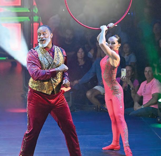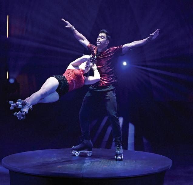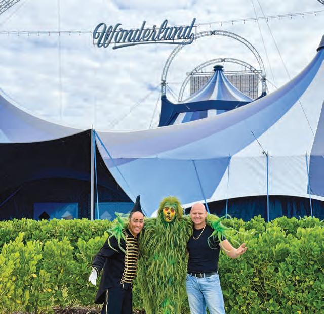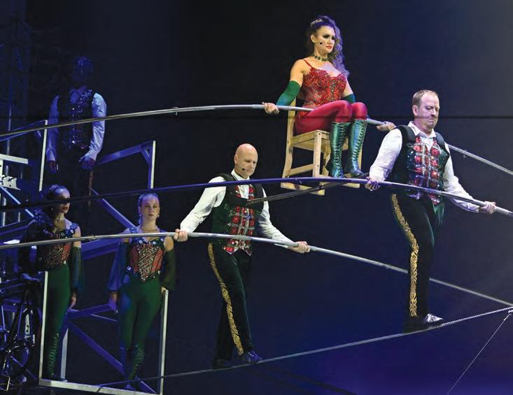 defying stunts Nik has performed during his career, crossing Times Square, Niagara Falls, the Grand Canyon and even an active volcano in Nicaragua, you start to understand the meaning of the old theater expression “The show must go on.” The show continues at UTC in a blue-and-white stripe tent with a black interior that features circus stars from all over the world. Wallenda says he and Erendira ordered the tent from Cannobio Textile and Architecture of Italy about 20 months ago. “It’s like the Ferrari of tents,” he says. With its video screen surrounded by a proscenium, the Wonderland tent evokes a theater, which is by design. Wallenda says his new tent