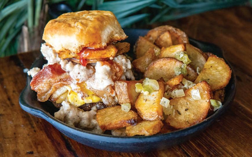 I found it with a slew of sausage gravy options. The original biscuit and gravy dish ($8) is served with two Southern-style biscuits with homemade sausage gravy. Get crazy and add pepper jelly for $1 or dine on the dish “Drop It Like It’s Hot Benny” ($14), with Nashville hot chicken, pickles, sausage gravy, sunny-side-up eggs and biscuit. Let’s Get This Gravy: Don’t hop off the gravy train yet, foodies. The epic brunch burger ($11) calls for stretchy pants and an appetite. Made with ground beef and topped with American cheese, bacon, a fried egg, sausage gravy, sriracha syrup and sandwiched within a biscuit, this entrée is a whole lot of flavor — especially with the side of Cajun potatoes.