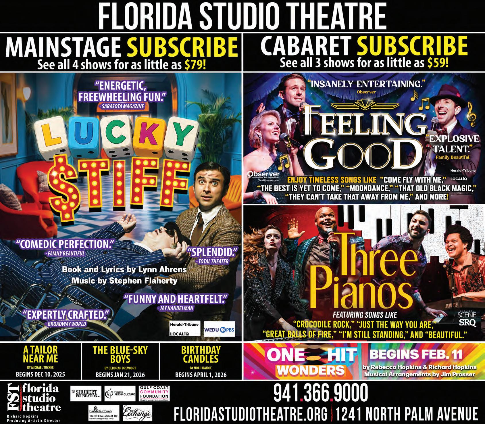 The Venice Theatre’s production of “A Christmas Carol” celebrates its 25th anniversary as veteran Brad Wages returns as Ebeneezer Scrooge and newcomers take the stage for the first time. If you’re feeling as generous as Scrooge after his ghostly visits, consider a donation to the Venice Theatre, which is still rebuilding after the Jervey Theatre was damaged by Hurricane Ian. Runs through Dec. 21.
