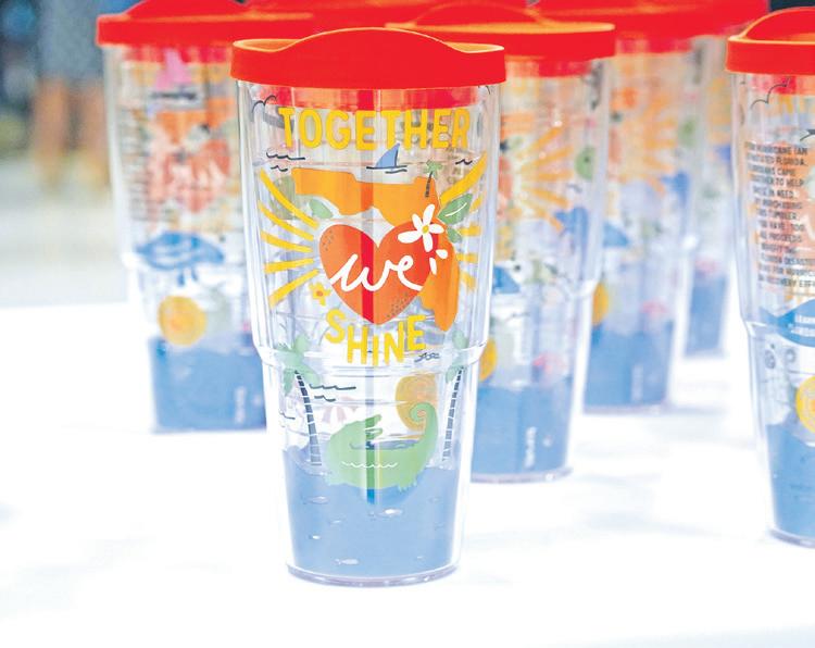 alligator, a manatee, a sailboat, a golf hole, a flamingo and a rocketship. It was created to represent the Florida community coming together in others’ times of need. The tumbler can be purchased at Tervis stores and through the website. The 24-ounce tumbler is available for $21.99 and the water bottle costs $26.99.