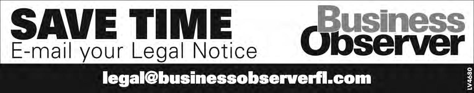 clerk of court and to serve a copy within 30 days after the first publication of the Notice of Action, on Albertelli Law, Plaintiff’s attorney, whose address is P.O. Box 23028, Tampa, FL 33623; otherwise, a default will be entered against you for the relief demanded in the Complaint or petition. This notice shall be published once a week for two consecutive weeks in the Business Observer. If you are a person with a disability who needs any accommodation in order to participate in this proceeding, you are entitled, at no