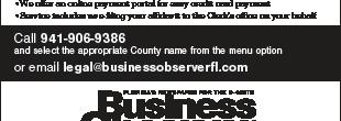 The Business Observer meet the legal requirements to publish legal and public notices in Sarasota, Manatee, Lee, Collier, Charlotte, Hillsborough, Pasco, Pinellas and Polk counties, per F.S. 50.011.
