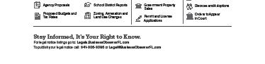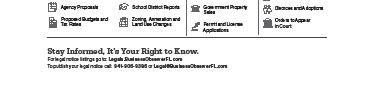 To send Public Notices, email to: legal@BusinessObserverFL.com. Name the county of interest in the subject line and attach notice. Deadline for public notices is noon Wednesday. For Display Advertising, call (941) 362-4848. Deadline for display advertising space is noon Friday.