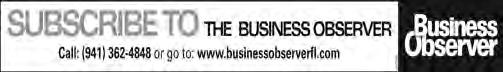 To send Public Notices, email to: legal@BusinessObserverFL.com. Name the county of interest in the subject line and attach notice. Deadline for public notices is noon Wednesday. For Display Advertising, call (941) 362-4848. Deadline for display advertising space is noon Friday.