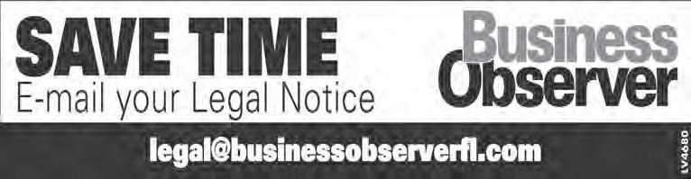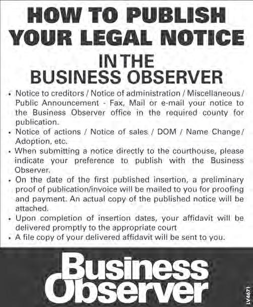 To send Public Notices, email to: legal@BusinessObserverFL.com. Name the county of interest in the subject line and attach notice. Deadline for public notices is noon Wednesday. For Display Advertising, call (941) 362-4848. Deadline for display advertising space is noon Friday.