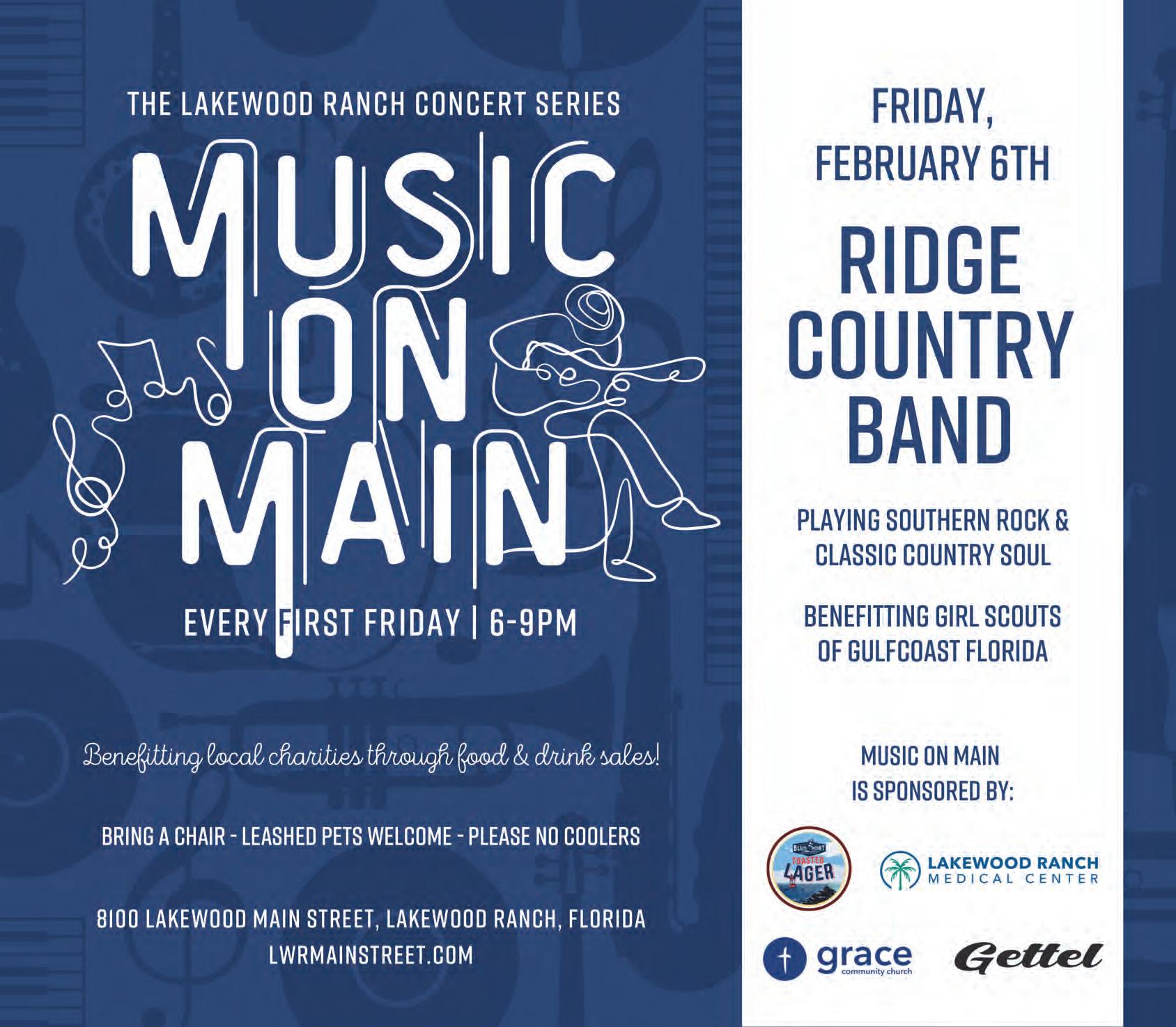 Runs from 6-9 p.m. at Main Street at Lakewood Ranch. The Ridge Country Band will be entertaining the crowd at Music on Main with Southern rock and classic country. Proceeds from the free music series and block party benefits the Girl Scouts of Gulf Coast Florida. The event features food vendors, beer trucks, sponsor booths and kids activities.