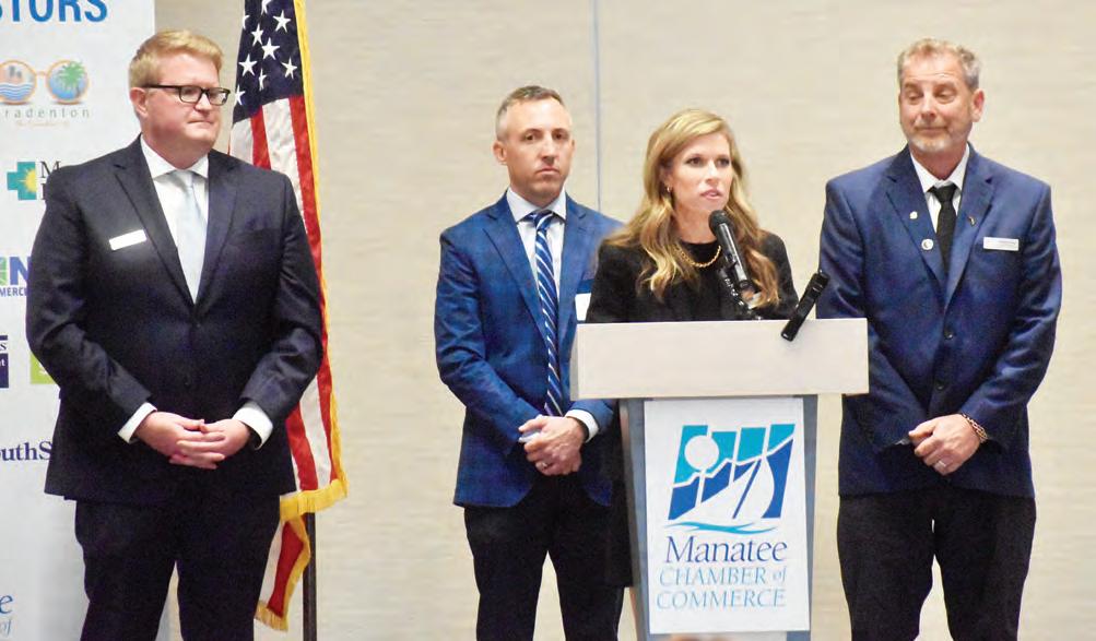 Manatee County administrators Corey Stutte, Bryan Parnell, Courtney De Pol and Charlie Bishop speak at a Manatee Chamber of Commerce meeting in December. On Jan. 28, all four spoke to commissioners about a temporary hiring freeze.