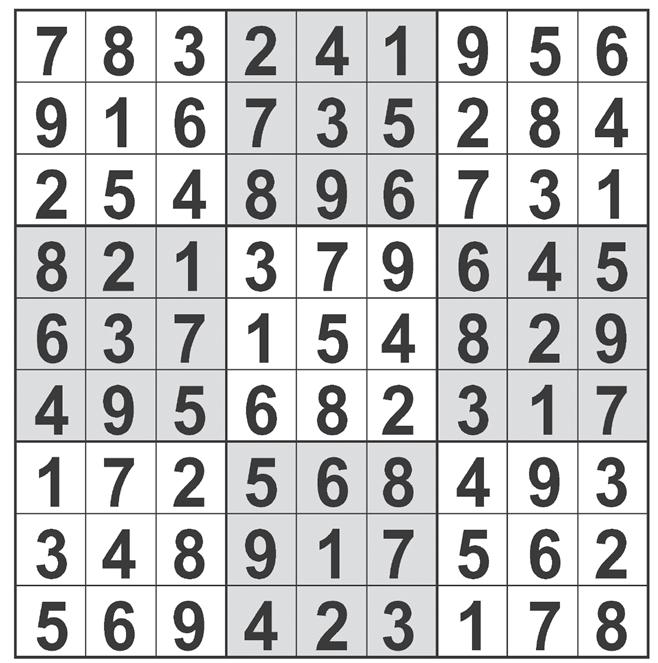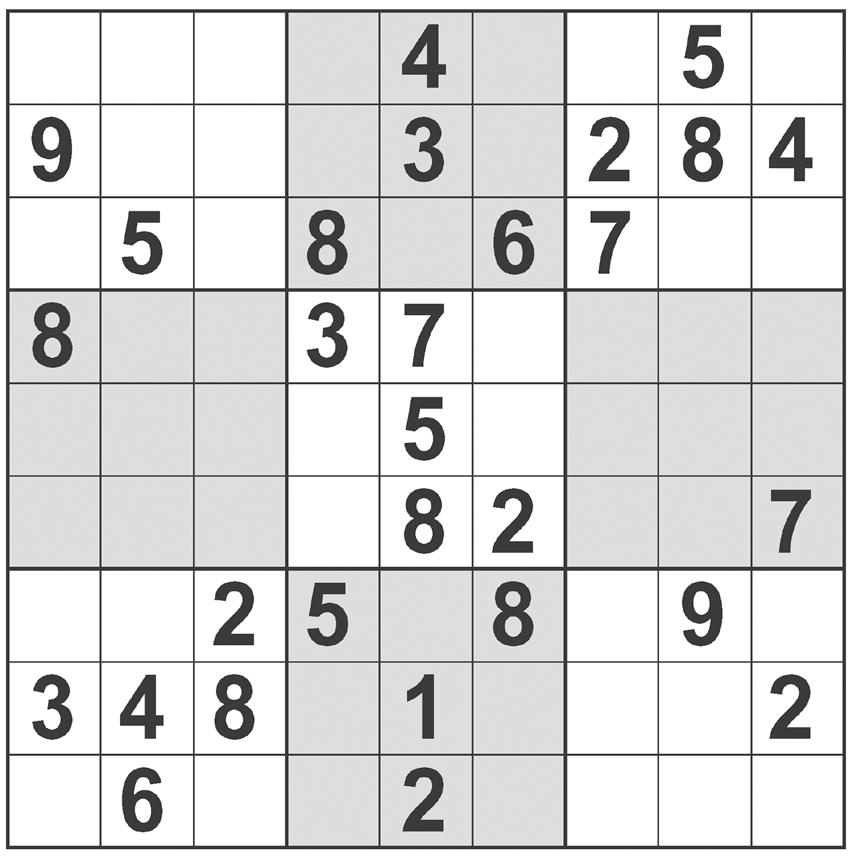 sudoku Complete the grid so that every row, column and 3x3 box contains every digit from 1 to 9 inclusively. ©2022 Andrews McMeel Syndicate crossword ©2022 Universal Uclick ACROSS 1 Tampering (with) 8 Alan born Alphonso D’Abruzzo 12 Letter before Bravo 16 Former romantic partners 18 Winds, as a hose 20 Crossword enthusiasts, stereotypically 22 *Valedictory address 25 Garden statuette 26 Shannon of Thirty Seconds to Mars 27 Oklahoma tribe 28 Put a new title on 30 Pimple 31 Snoozed 33 *Places for construction site advisors 37 Comedian Andre 40 Deer mothers 41 Celine who’s the bestselling French language singer 42 Cricket club 45 Roman emperor hidden in “hothouse” 47 “Later, ___!” 50 Strands after a cold snap 53 *Passionate adoration 56 Hajj destination 58 In vitro eggs 59 Unleashed 60 Totally smitten 61 ___ mode (with ice cream) 62 Video game slowness 63 Movable car roof 65 *Adverse event 72 Womb-related 75 A, in Argentina 76 What a bargain hunter might circle on a calendar 77 *Adrift at sea 81 Psychedelic journey 82 Lead-in to “Dhabi” 83 Oolong, e.g. 84 Common Swedish name 86 Coal cart 90 Triple ___ (liqueur) 91 “Pray tell!” 93 *Advantage point in tennis 96 Cholesterol reducer 98 Exciting action in poker 100 Netlike material 101 Private Twitter chats 102 Amphitheater level 103 Fix, as hand-me-downs 105 Singer Redding 107 *Embarrassing advice 113 Unisex fragrance since 1994 117 “So is that ___?” 118 Part of a minute 119 Versatile, electrically 122 Big events for CFOs 123 Game with cards of numbers 125 *Addiction specialist 129 Buttoned-down 130 Make a call on a dating app? 131 2008 political fervor 132 “Frozen” princess 133 Leave agog 134 Web developers that catch bugs? DOWN 1 Lunches, e.g. 2 Be brilliant 3 Roofing rock 4 “Totally awesome!” 5 “___ had enough!” 6 Striped fish in Pixar films 7 Mental resolve 8 Asexual, informally 9 Journal 10 Journal keeper 11 Kind of wrench 12 Ross of “Pose” 13 NFL Hall of Famer Dawson 14 Hardly cold? 15 Come clean about 17 Garbage barge 19 Perform karaoke 21 Hardens, as cement 23 Marsh plant 24 “Bliss!” 29 Battlefield doc 32 Helen of ___ 34 Twitter’s blue bird, e.g. 35 Faculty head 36 Nickname for Maurice 38 “That ball isn’t coming back!” 39 Economy fare? 42 Ride-or-die pal 43 Show on TV 44 Peg on the links 46 The “O” of WHO (Abbr.) 48 Congresswoman Ilhan 49 Depend (on) 51 Name that anagrams to “avian” 52 Prone to pestering 54 Back in fashion 55 Atlas part 57 Driver’s sound system 64 Muscle spasm 66 Yes, in Evian 67 Cease 68 Price label 69 Sincere 70 “Baby Cobra” comic Wong 71 Swimming pool measure 72 Amherst sch. 73 Land of Everest’s North Base Camp 74 Having intellectual value 78 Approach 79 Disney warrior princess of 2021 80 Medium’s rare gift (Abbr.) 85 Vigor’s partner 87 “Way cool!” 88 Cornhole asset 89 “The Marvelous ___ Maisel” 91 Light pop? 92 Deli sandwich specifica tion 93 Applications 94 Deli list 95 Runway-ready 97 As late as, briefly 99 Cry after arriving at the last minute 104 “Fudge!” 106 Button over a YouTube video interruption, and a hint to interpreting each starred clue 107 Chatters 108 “Workers of the world, ___!” 109 Lenovo machines 110 Hacks (off) 111 Celebrity gossip show 112 Repeat word-for-word 114 Share a take 115 Polite refusal 116 “Como ___?” 120 Newbie socialites 121 Unlucky throw in a dice game 124 USO audience mem bers 126 Laptop core 127 Rooster that’s not a rooster 128 Coy response to “You’re kidding” WATCH THE COMMERCIALS! by Ross Trudeau. Edited by David Steinberg