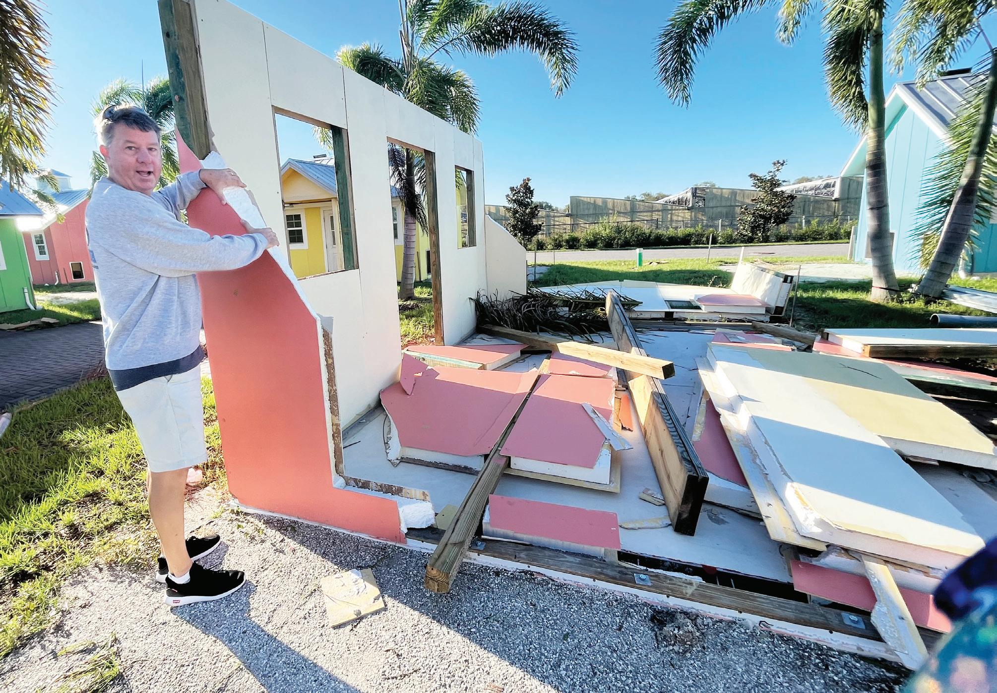 Rob Oglesby, Nate’s Honor Animal Rescue’s development director, says panels from the cottages that were wrecked by Hurricane Ian are salvageable.