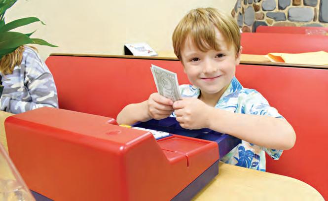 Kindergartner Cason Collier is beaming with pride as he serves water to customers.