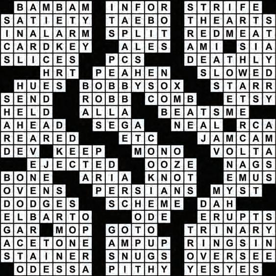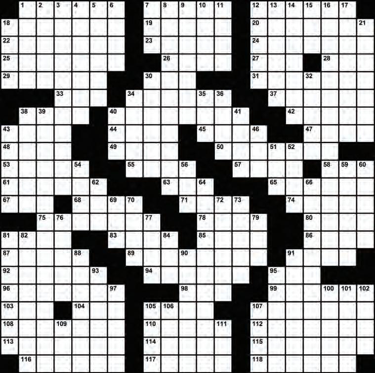 32 EAST COUNTY OBSERVER | THURSDAY, MAY 18, 2023 YourObserver.com celebrity cipher sudoku Complete the grid so that every row, column and 3x3 box contains every digit from 1 to 9 inclusively. ©2023 Andrews McMeel Syndicate crossword ©2023 Universal Uclick ACROSS 1 Camila Cabello hit with a repetitive title 7 Soon to receive 12 Discord 18 State of fullness 19 1990s cardio-boxing program 20 Literature and drama, e.g. 22 Nervously 23 Banana ___ 24 Beef, for one 25 Hotel door opener 26 Bubbly brews 27 French friend 28 Mononymous “Cheap Thrills” singer 29 Pizza divisions 30 Apple alternatives 31 “Harry Potter and the ___ Hallows” 33 Gender-affirming treatment, for short 34 Bird with an eye for eyes? 37 Decelerated 38 Red and green, say 40 Fashionable 1950s footwear 42 Ringo of the Beatles 43 Pop in the mail 44 Ned’s eldest on “Game of Thrones” 45 Fixer of hairy problems? 47 Online crafting marketplace 48 Occupied, as an office 49 Penne ___ vodka 50 “No clue!” 53 In the lead 55 Big name in 1980s gaming 57 Patricia of “The Day the Earth Stood Still” 58 Record label now owned by Sony 61 Brought up 63 List ender (Abbr.) 65 Traffic reporter’s eye in the sky, in slang 67 MSFT coder 68 Hold on to 71 Stereo alternative 74 Ghanaian river or Italian physicist 75 Tossed out of a game 78 Sluggishly spread 80 Badgers 81 Fibula, for example 83 Solo for Leontyne Price 85 Square ___ 86 Makers of green eggs but not ham 87 Turkey bakers 89 Thermopylae combatants 91 Classic 1990s puzzle game 92 Weaves, in a way 94 Devilishly devious design 95 Morse code dash 96 Nickname spray-painted on the Kwik-E-Mart 98 “___ to Joy” 99 Emulates Etna 103 Fish with a long snout 104 Deck swabber’s tool 105 BASIC command 107 Threefold 108 Chemical that gives nail polish remover its smell 110 Boost, in slang 112 Greets, as the new year 113 Person dyeing for desk work? 114 Nestles 115 Manage 116 Black Sea port 117 Like proverbs 118 “All right, already!” DOWN 1 Old hat 2 Big name in 1970s gaming 3 Grilled cheese ingredient that comes in singles? 4 Holders of some solutions 5 Completely still 6 “Heavens to Betsy!” 7 Third-person pronoun 8 Vegetable that fits the bill for kimchi? 9 Just missed 10 Off-Broadway award 11 Decays 12 Priceless violin, briefly 13 Most crosswords and essays have them 14 Tries anew to get through 15 “___ Spock” (Leonard Nimoy autobiography) 16 Raw bar offerings found in banks? 17 Cyber Monday sellers 18 Lets the dogs loose 21 Use an umbrella, perhaps 30 ___ Beach 32 Ojibwa clan symbol 34 Tournament groupings 35 “Back” button 36 Hopeless gaming neophyte 38 Tittering sound 39 Tender side like roti or tortillas? 40 Sports ___ 41 Marvel-ous group? 43 Pottery fragment 46 Main squeeze 51 ___ Mahal 52 Slovene or Slovak, say 54 Ice hockey fake 56 Bank amenity, briefly 59 Tennis racket string material, once 60 Compile 62 Present time? (Abbr.) 64 Ice cream flavor that might be mint-based? 66 Greedy and avaricious ... like someone devouring the ends of 3-, 8-, 16-, 39- and 64-Down 69 ORD guess 70 “Law & Order” suspect 72 Generic, as groceries 73 ___ layer 76 Game that always ends in collapse 77 Molds 79 “Star Trek” extras in makeup, briefly 81 Small corner stores 82 Type of vegetarian 84 Curving trajectory 88 Some Martin Luther King Jr. orations 90 Olympic event with heavy weights? 91 “Semper Fidelis” service members 93 Precious gems 95 Obtain, as a formula 97 Genre for Leontyne Price 100 No longer in vogue 101 Makes an effort 102 “Auld Lang ___” 105 Shocked reaction 106 Hotel chain whose name means “all” 107 “Iliad” setting 109 20-20, say 111 “Gangnam Style” performer