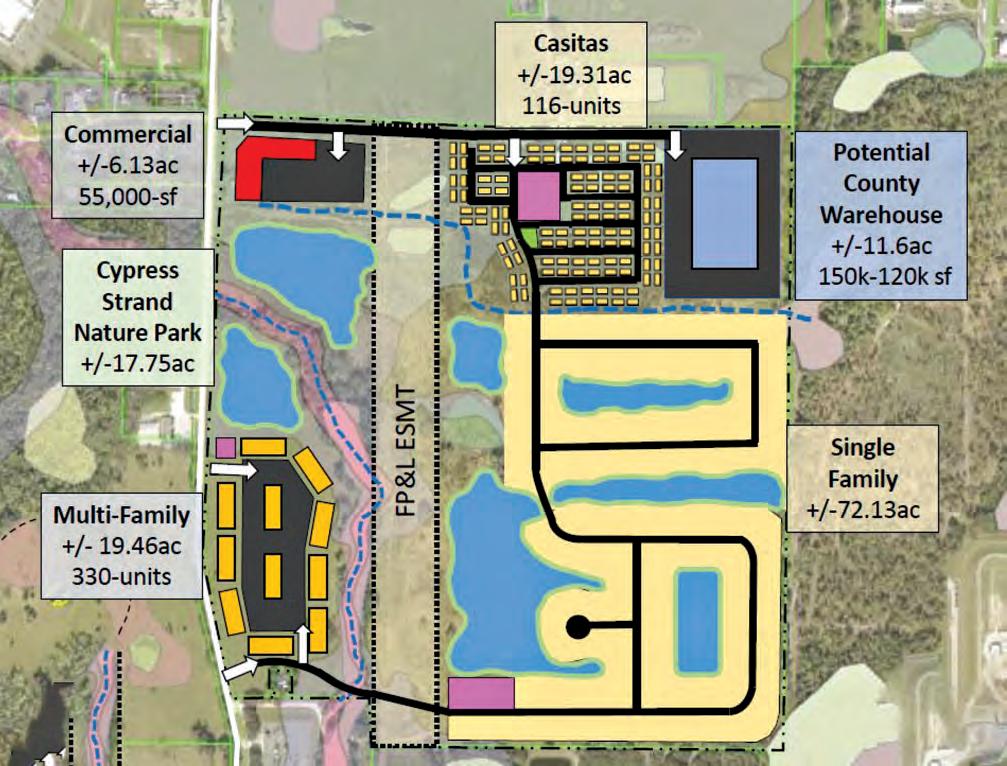 Proposal by D.R. Horton: Build a $187 million mixed-use project that would include 116 single-family rental cottages, 222 single-family detached homes and 300 multifamily residences. Six acres would be set aside for commercial use and 11 acres for a warehouse site to be used by the county.