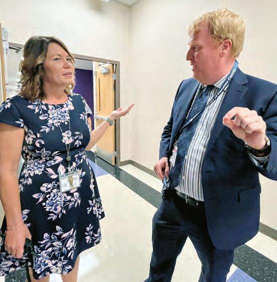 Kathy Price, the principal of Robert E. Willis Elementary School, discusses how the first week of school is progressing with Superintendent Jason Wysong as he tours the school.