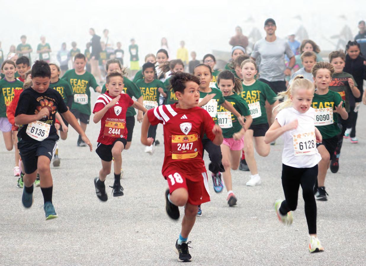 Eight-year-old Liam Griego (2447) leads runners out of the fog during the Florida Turkey Trot kids run at Nathan Benderson Park on Thanksgiving Day.