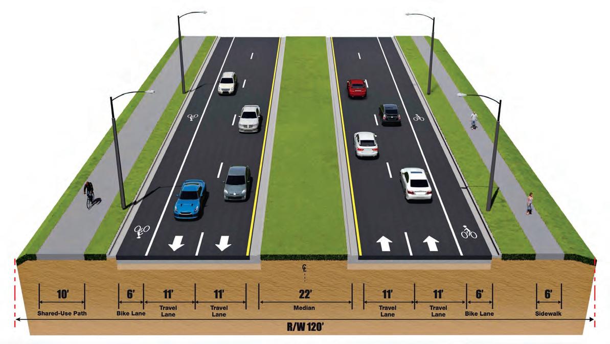 Beyond two extra lanes, the road will also incorporate a raised median, roundabouts, bicycle lanes, a shared use path on one side and a sidewalk on the other.