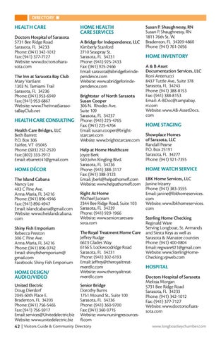 Health Care Doctors Hospital of Sarasota 5731 Bee Ridge Road Sarasota, FL 34233 Phone: (941) 342-1012 Fax: (941) 377-7127 Website: www.doctorsofsarasota.com The Inn at Sarasota Bay Club Mary VanSant 1303 N. Tamiami Trail Sarasota, FL 34236 Phone: (941) 953-6949 Fax: (941) 953-6867 Website: www.TheInnatSarasotaBayClub.net