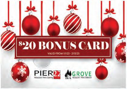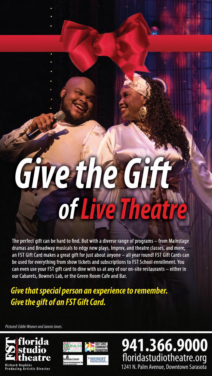 42 HOLIDAY GIFT GUIDE | 2022 380683-1 When basic costs increase, food can be the first to go. You can help put food back in the bag this holiday season. Give today at allfaithsfoodbank.org 941.379.6333 Turn empty plates into ThankFULL hearts. SELECT NIGHTS DECEMBER 10 – JANUARY 5 a holiday tradition TICKETS AT SELBY.ORG 390713-1 SAILING FROM 2 LOCATIONS Longboat Key | Downtown Sarasota Kathleen D Sailing Catamaran 941-896-6400 WWW.KATHLEEND.NET Let’s Sailing!Go DOLPHIN WATCHES SUNSET SAILS DAY SAILS PUBLIC CHARTERS PRIVATE CHARTERS SNORKELING SHELLING Gift Certificates Available for Holiday Gift Giving 392211-1 TREAT YOURSELF TO A $20 BONUS CARD FOR EVERY $100 IN GIFT CARDS PURCHASED! Offer ends Dec. 31, 2022. Other restrictions may apply. Purchase in restaurant or at GROVELWR.COM THIS HOLIDAY SEASON, give the gift of great taste! TREAT YOURSELF TO A $20 BONUS CARD WHEN YOU PURCHASE $100 IN GIFT CARDS. Purchase online or at the restaurant until 12/31/22 to claim your Bonus Card. Visit grovelwr.com to view our upcoming Holiday Events, including New Year’s Eve! 10670 Boardwalk Loop | (941) 893-4321 390672-1